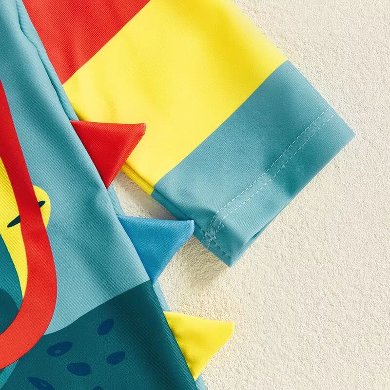 Make a splash with this adorable little boy swimsuit, designed for both style and sun protection. Featuring two playful designs—one with a cool dinosaur on navy blue with striped sleeves and the other with a fun scuba-diving dino in bright colors—these swimsuits are perfect for summer adventures. Each set includes a matching swim hat for added sun protection, making it ideal for beach days, pool parties, or water play.