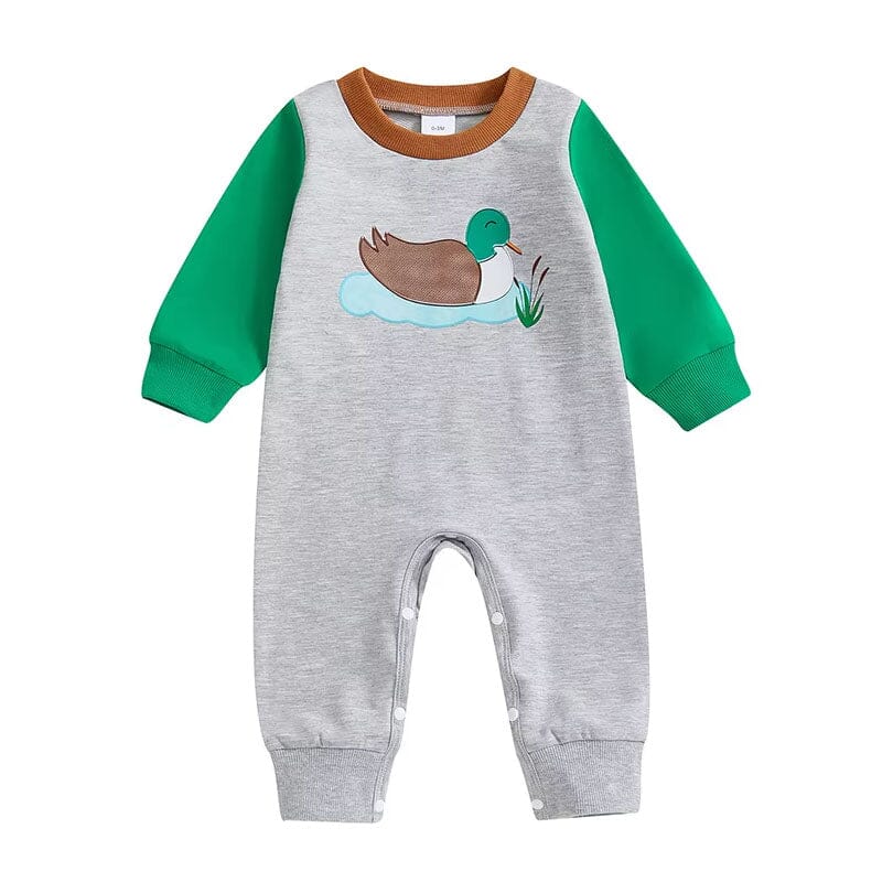 Make a splash with our adorable duck-themed jumpsuit, designed to keep your little one cozy and cute. This one-piece features a playful duck graphic serenely floating on water, set against a soft grey backdrop with vibrant green sleeves that brighten the overall look. Practical snap buttons along the legs make diaper changes quick and fuss-free, a must-have for busy parents. Perfect for daily wear or a charming photo-op, this jumpsuit is a wardrobe essential for any fun-loving baby