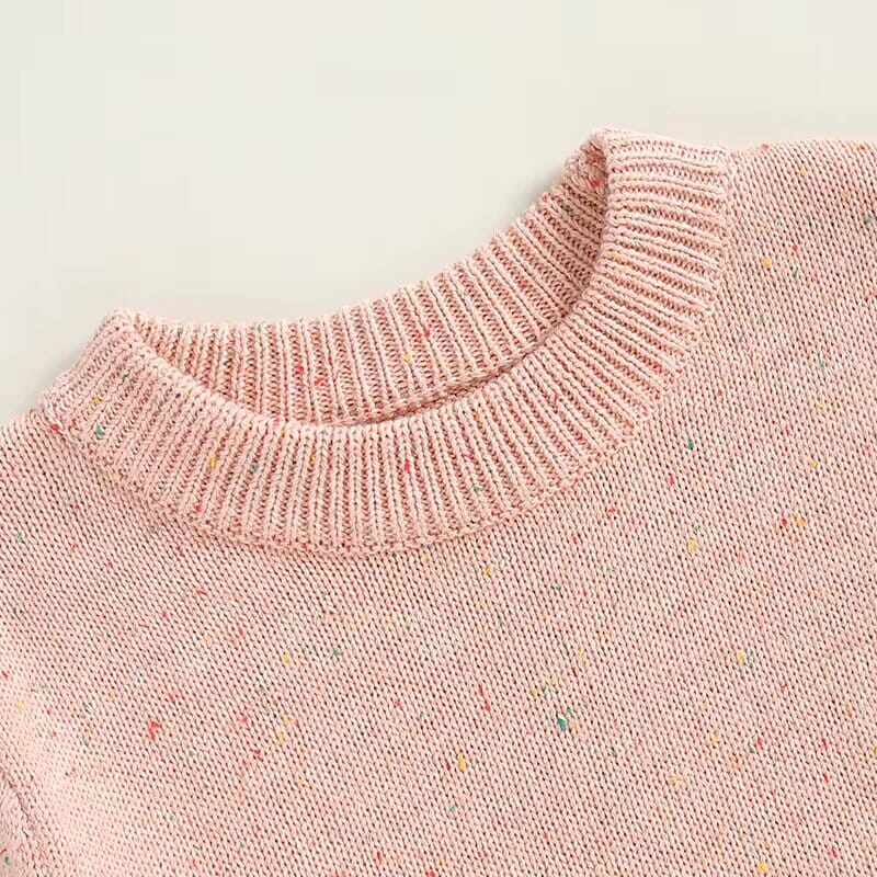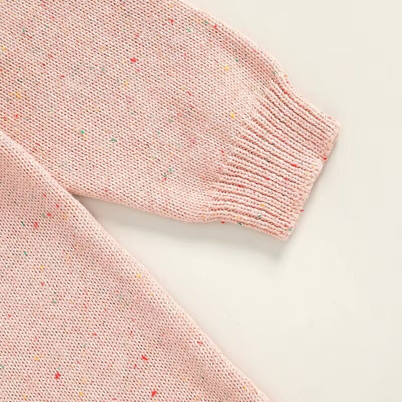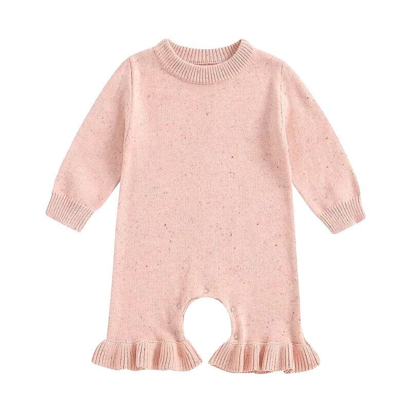 This sweet baby girl romper features a soft, knitted design with delicate ruffle details at the leg openings, adding a charming touch. The long sleeves and cozy material make it perfect for cooler days, while the snap closures ensure easy diaper changes. With its classic, neutral pink hue and simple yet adorable design, this romper is ideal for any occasion—whether it's a family gathering or a cozy day indoors.