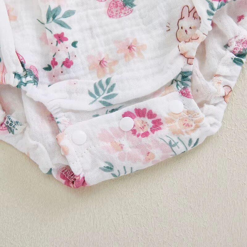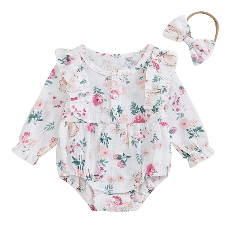 Welcome spring with our enchanting floral romper, an ideal choice for your little girl's Easter celebrations. Adorned with a delicate pattern of soft pinks and greens, this romper features whimsical bunny motifs nestled among blooms, embodying the joy of the season. Ruffle accents and a coordinating bow headband add a touch of sweetness to this festive outfit. Ensure your little one looks as fresh and lovely as a spring garden in this beautifully designed Easter romper.
