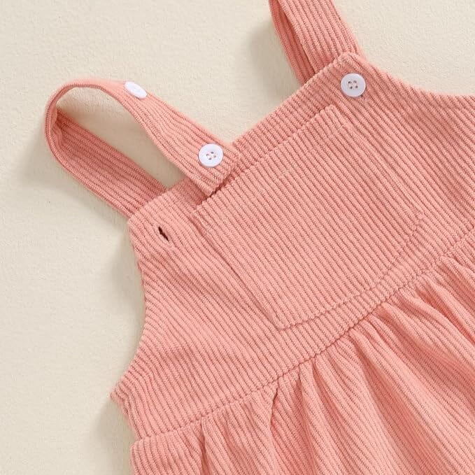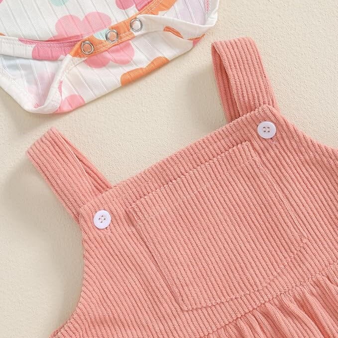Dress your little one in delightful style with this charming baby girl set, available in two adorable styles. The set includes a beautifully patterned long-sleeve bodysuit, adorned with vibrant floral designs, paired with a complementary corduroy suspender skirt that adds a touch of playful charm. With its sweet and stylish design, this set is sure to be a hit for any occasion, capturing the joyful spirit of childhood in every detail.
