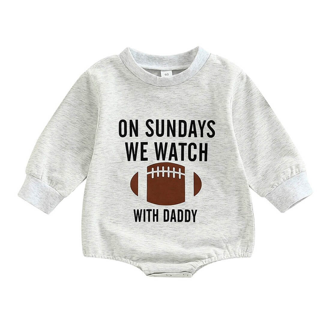 This adorable long sleeve unisex baby bodysuit features the playful and catchy phrase "On Sundays we watch football with Daddy". Made with soft and high-quality fabric, this bodysuit is perfect for all-day comfort and mobility. Whether you are a football family or not, this bodysuit is a must-have for any stylish and sporty baby.