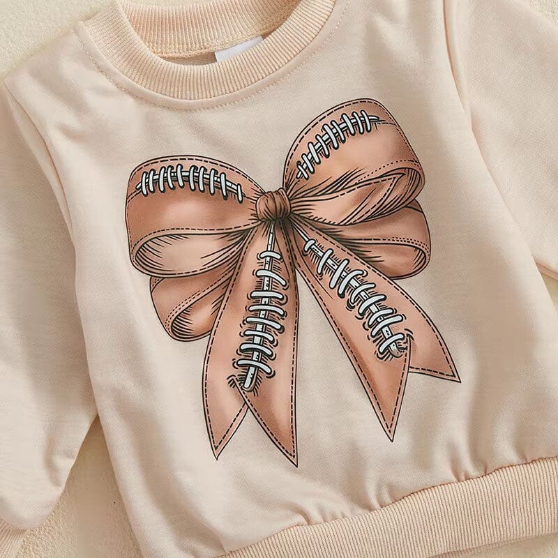 This exquisite little girl set is a delightful blend of sporty charm and feminine flair, perfect for the tiny football fan in your life. The cream-colored sweatshirt features a stunningly detailed bow print that resembles football laces, bringing a unique twist to traditional sports apparel. Coordinating pants adorned with miniature football prints enhance the theme, making this outfit a standout at any game day gathering or casual event.