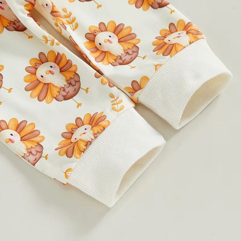 Celebrate Thanksgiving in style with this adorable baby girl set, complete with a charming sweatshirt and matching pants. The top features the playful phrase "Gobble till you wobble," perfectly capturing the festive spirit. Adorned with a pattern of cute turkeys surrounded by autumn leaves, the leggings complement the sweatshirt beautifully. Soft, breathable fabric ensures your little one stays comfortable throughout all the Thanksgiving Day festivities.