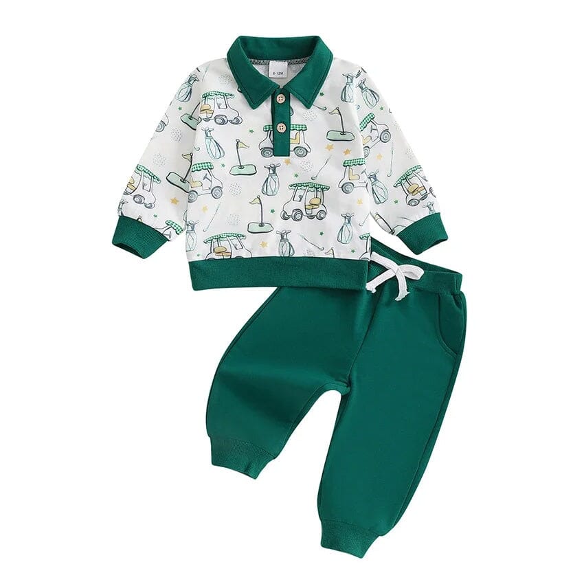 This toddler boy set is a playful nod to the sport of golf, featuring an adorable pattern of golf carts and related accessories in a fresh and vibrant design. The white polo-style top is embellished with charming golf-themed graphics, giving it a spirited and youthful look. Paired with deep green jogger pants, this set offers both comfort and style, ensuring your little one moves freely during his adventures on and off the play area. Ideal for a casual day out or themed parties, this set keeps your young golfer looking fashionable and ready for fun.