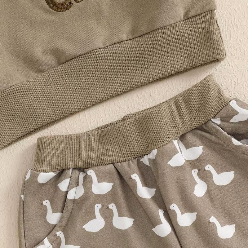 This adorable unisex baby set is designed to keep your little one cozy and stylish all day long. Featuring a charming goose applique on the sweatshirt and matching goose-print joggers, it brings a touch of playful elegance to everyday wear. With a neutral earthy tone, this set is versatile and suitable for both boys and girls. Easy to put on and take off, it’s an ideal outfit for busy parents and their little ones.