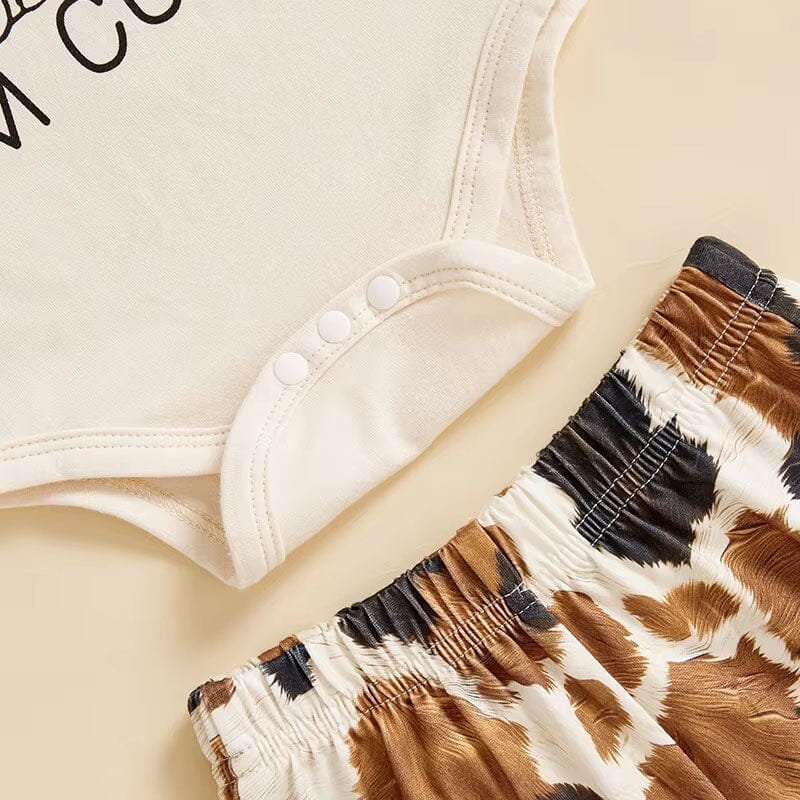 This adorable baby girl set is sure to make everyone exclaim "Holy Cow, I'm Cute!" with its playful and charming design. The ensemble includes a cream-colored bodysuit adorned with a cute cow illustration and a matching phrase that adds a whimsical touch. The pants boast a bold and trendy cow print pattern that's eye-catching and stylish.