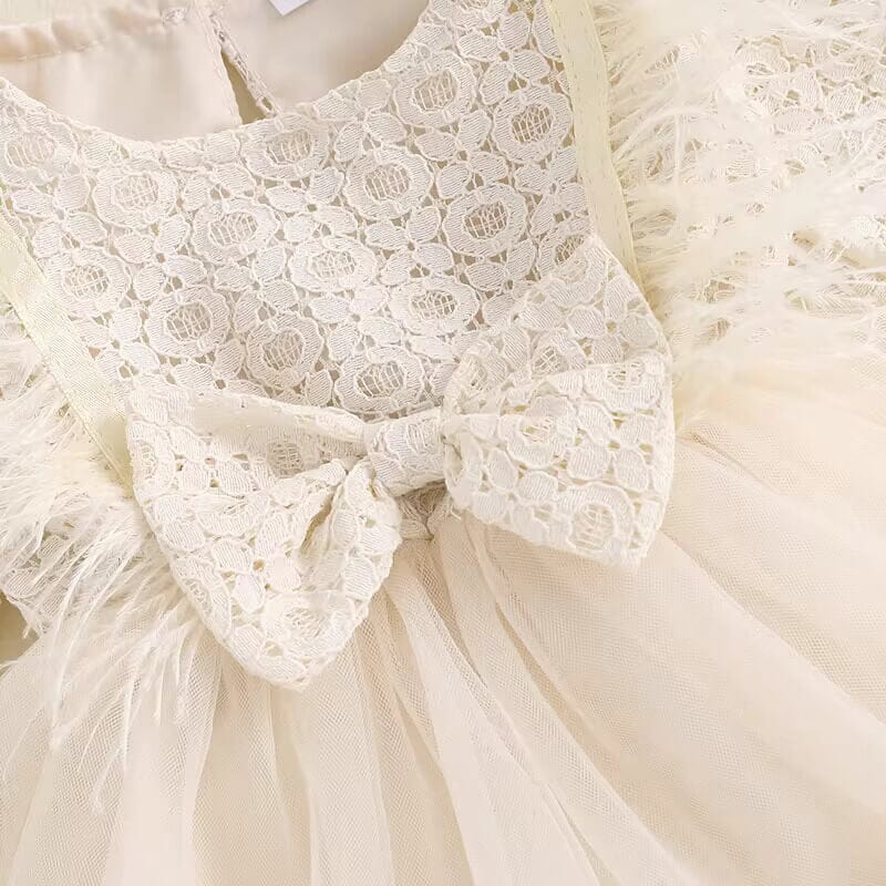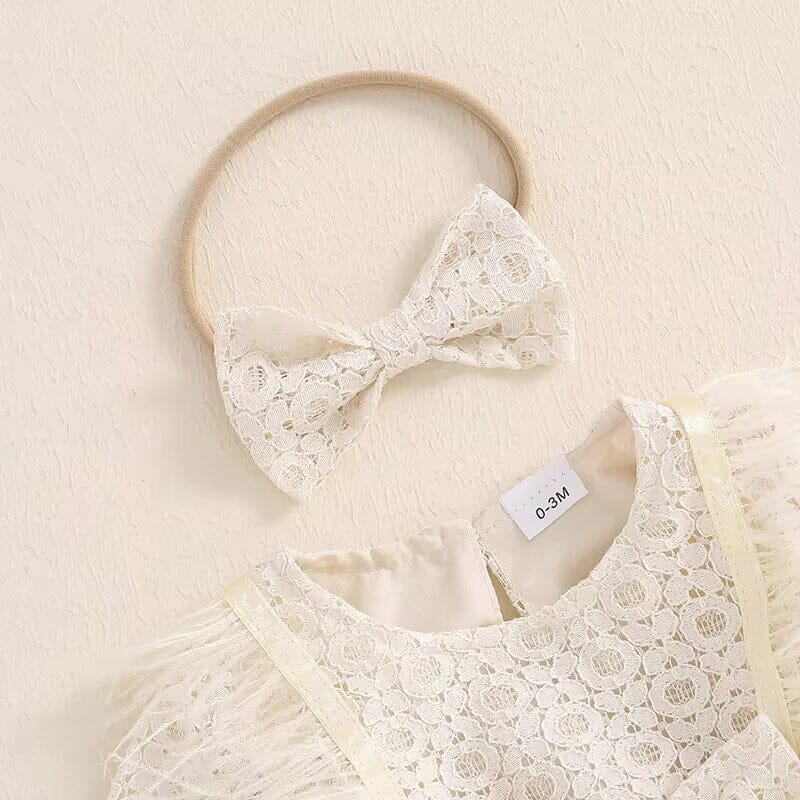 This baby girl dress set is perfect for special occasions, offering a delicate and elegant look. The dress features intricate lace detailing on the bodice and sleeves, complemented by a full tulle skirt that adds a touch of whimsy and charm. A large bow at the waist enhances the overall design, making it a standout piece. The set is completed with a matching headband, making it ideal for weddings, photoshoots, or festive celebrations.