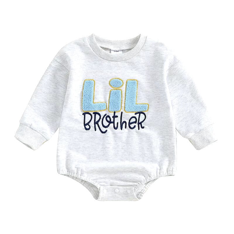 This cozy "Lil Brother" bodysuit is a perfect addition for your little one’s wardrobe, celebrating their sibling status with style! The bodysuit features a soft, heather gray fabric with a charming "Lil Brother" applique in bold, cheerful colors. With long sleeves for added warmth and a convenient snap-button closure for easy diaper changes, this bodysuit combines comfort with cuteness. Ideal for family photos or sibling matching moments, it's a must-have for any little brother.