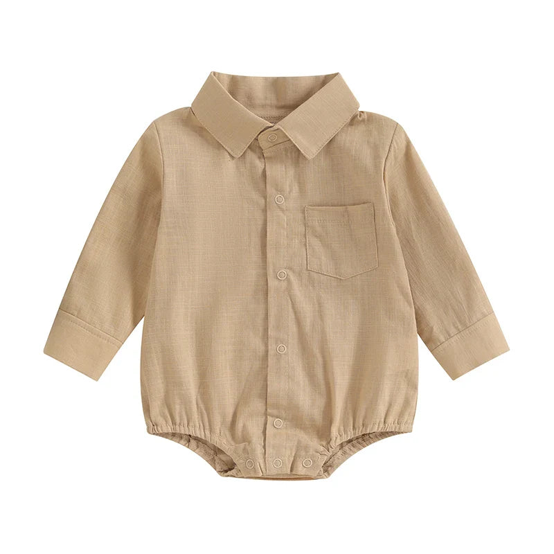 Elevate your little one's wardrobe with this classic and stylish baby boy long-sleeve romper. Featuring a collared neckline and button-down front, this infant dress shirt bodysuit combines the sophistication of a dress shirt with the comfort of a one-piece. A convenient chest pocket adds a touch of detail, while the snap closure at the bottom ensures quick and easy diaper changes. Perfect for special occasions, family photos, or everyday wear, this versatile baby boy dress shirt bodysuit is a must-have for any dapper baby boy. Collared neckline and button-down front for a polished look