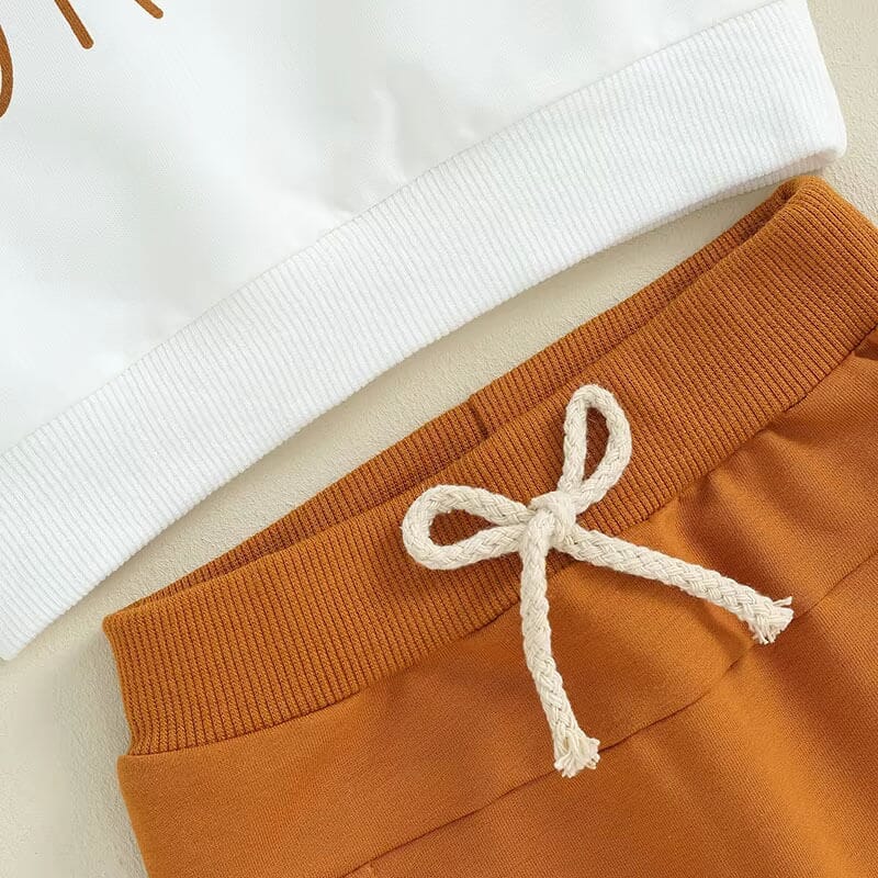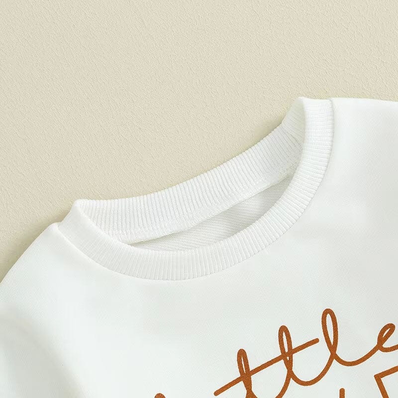 Get your little one ready for Thanksgiving with this charming unisex baby set, perfect for the holiday season. The set features a cozy white sweatshirt with the playful "Little Turkey" lettering in a warm brown tone, paired with matching brown jogger pants. Ideal for Thanksgiving gatherings or any fall occasion, this adorable set is a must-have for your little turkey.