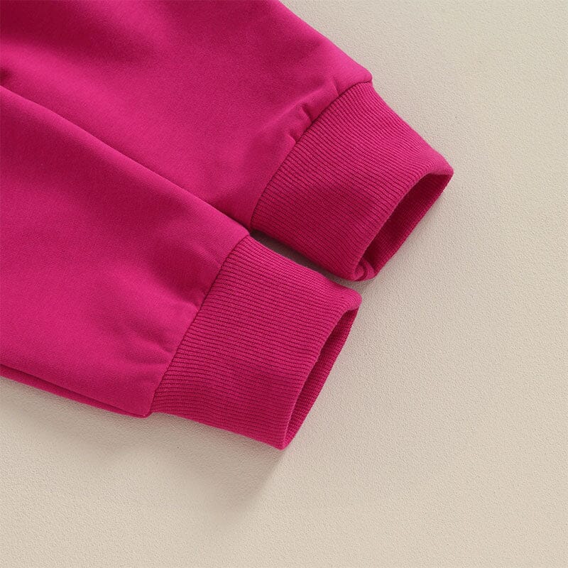 This little girl's set is a heartwarming ensemble, perfect for Valentine's Day or any day where love is celebrated. The cozy white sweatshirt features the adorable message "Mama's bestie," surrounded by vibrant hearts, making it clear who her first Valentine is. Paired with striking fuchsia pants, the outfit stands out with its delightful contrast of colors and its playful, loving spirit. This set not only provides warmth and comfort but also serves as a sweet reminder of the special bond between mother and daughter.