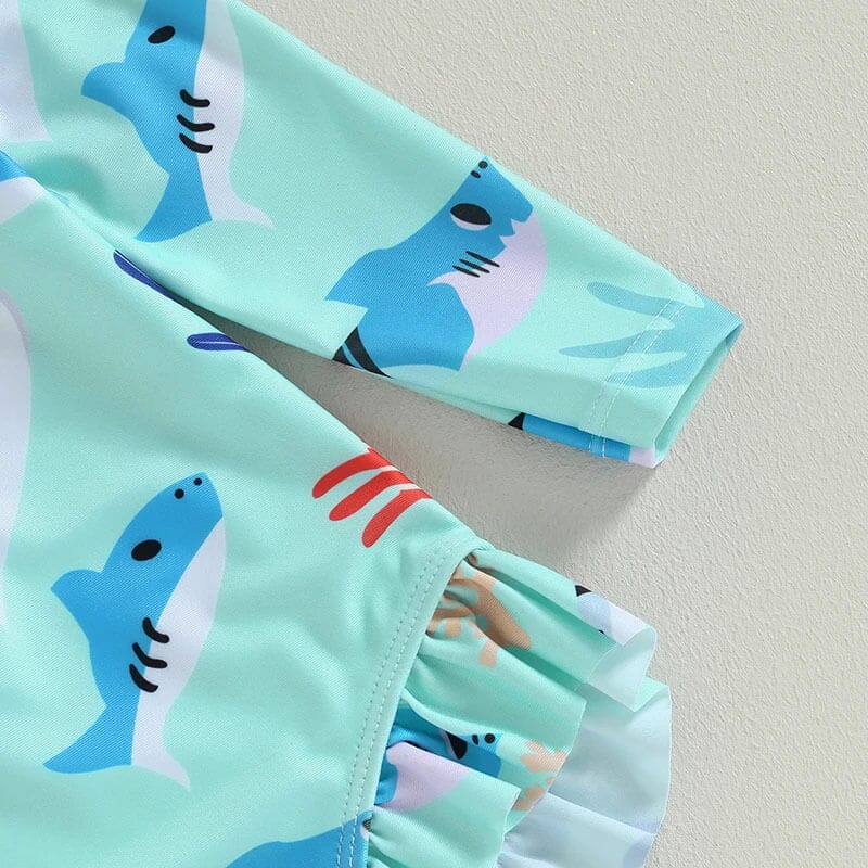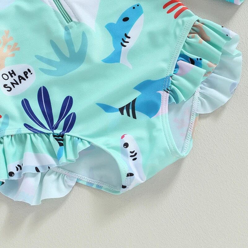 This little girl's long-sleeve swimsuit is perfect for fun in the sun while providing essential protection from the rays. It features a playful ocean-inspired print with cheerful sharks, coral, and fish in vibrant shades of blue and purple on a soft aqua background. The phrase "OH SNAP!" adds a whimsical touch, sure to delight any young swimmer. The suit comes with a front zipper for easy dressing and a ruffled leg opening for a touch of girlish charm.