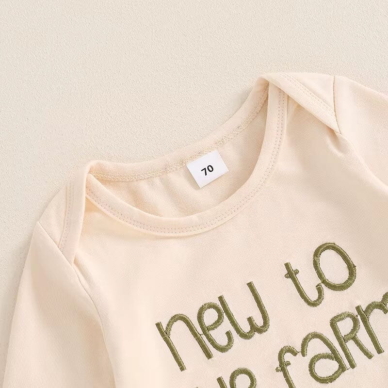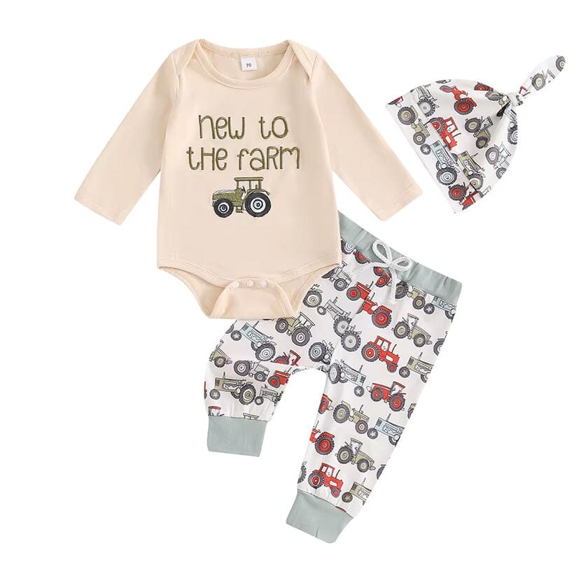 Welcome your little one to farm life with this charming baby boy set. The long-sleeve bodysuit features a playful "New to the Farm" print with an adorable tractor design, perfect for budding farm enthusiasts. Paired with cozy tractor-print pants, the outfit adds a touch of country charm to everyday wear. The matching knotted hat completes the ensemble, keeping your baby snug and stylish.