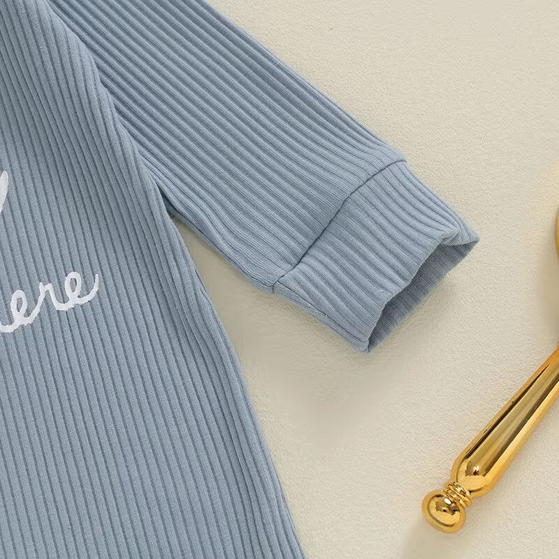Welcome your newest addition in style with this charming baby boy jumpsuit, available in three soothing colors: classic beige, serene mint, and soft blue. Each suit features a gentle "hi, I'm new here" script across the chest, adding a playful touch to your baby's wardrobe. The ribbed texture and soft fabric ensure maximum comfort, making it ideal for both play and nap times. This jumpsuit set is not only perfect for introducing your little one to the world but also makes a thoughtful gift for any new parent.