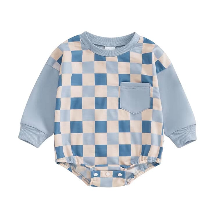 This charming unisex baby bodysuit comes in two delightful color schemes, each featuring a playful checkerboard pattern. The design is perfect for a modern and stylish look, keeping your little one both comfortable and on-trend. The contrasting solid color sleeves and matching chest pocket add a touch of whimsy and practicality. Ideal for casual outings or cozy playdates, these bodysuits are a versatile addition to any baby's wardrobe, offering ease and style in one adorable package.
