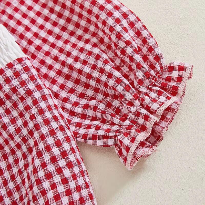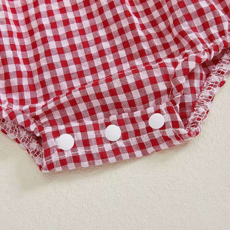 Celebrate love and cuteness this Valentine's Day with these enchanting baby girl rompers, available in classic red and sweet pink gingham patterns. Each romper boasts a crisp white Peter Pan collar that enhances its vintage charm, making your little one look picture-perfect. The front of the rompers features a row of adorable hearts bordered by delicate lace detailing, adding a touch of whimsy and festivity.