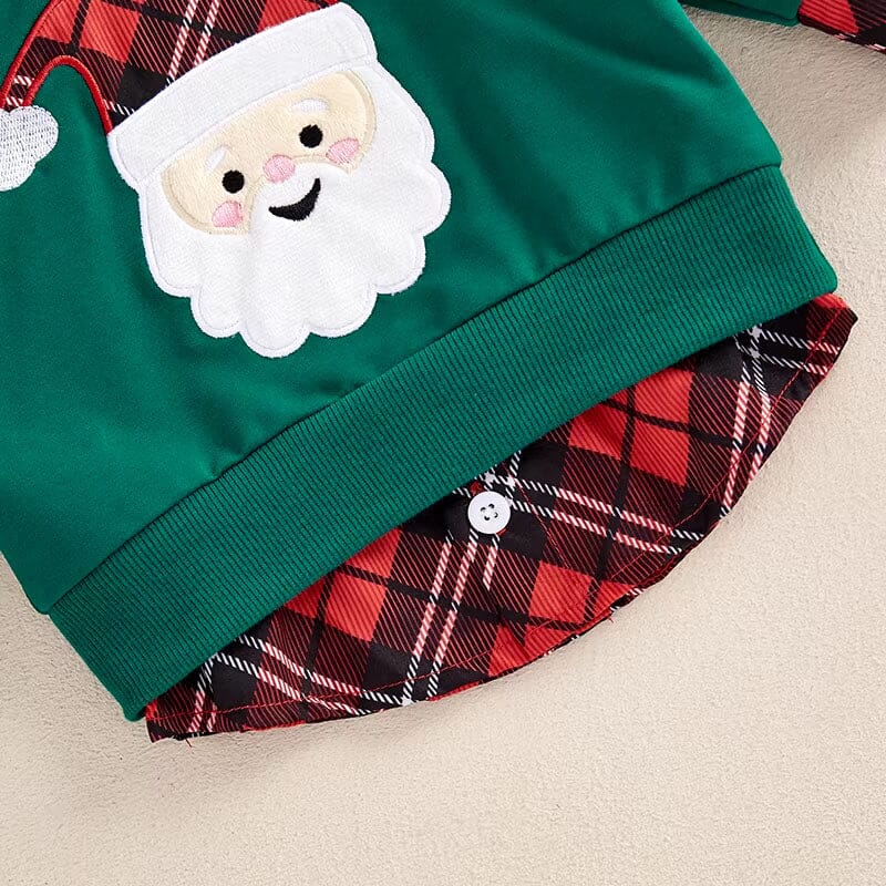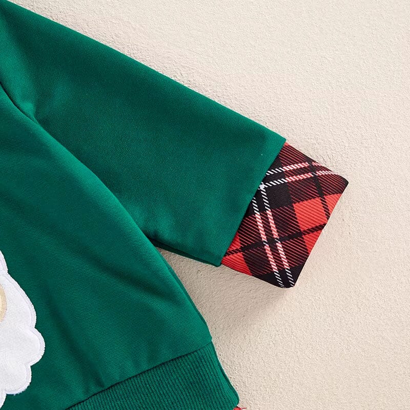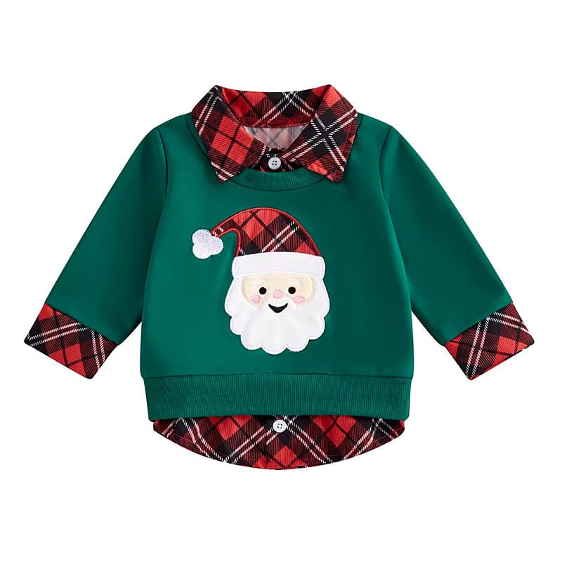 This delightful little boy's sweatshirt is a perfect pick for the festive Christmas season. Featuring a cheerful Santa Claus applique on a vibrant green background, it captures the joyous spirit of the holidays. The plaid collar and cuffs add a classic touch, making it ideal for holiday photos or family gatherings. It's a charming addition to any young boy's holiday wardrobe, ensuring he looks adorable during all Christmas celebrations.