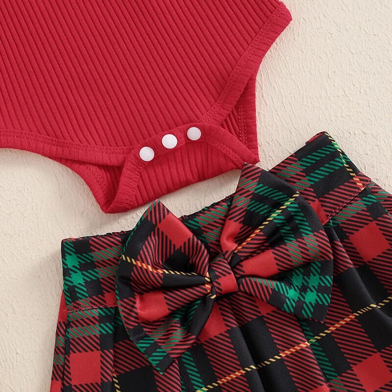 Get your little one ready for the holiday season with this adorable baby girl Christmas set. The set features a festive red ribbed bodysuit with delicate ruffle sleeves and button details, providing both comfort and style. It pairs perfectly with a charming plaid skirt adorned with a big bow, giving a classic holiday look that’s sure to impress. To complete the ensemble, a matching plaid headband adds a final touch of holiday cheer. This set is perfect for Christmas photos, family gatherings, or any festive celebration, keeping your baby girl cozy and stylish throughout the season.