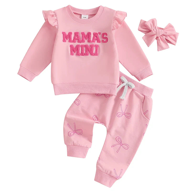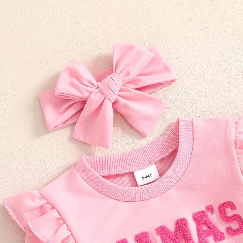 This adorable pink set is perfect for your little one who’s "Mama’s Mini"! The soft, cozy sweatshirt features playful ruffle sleeves and bold, fuzzy lettering that says "Mama’s Mini," adding a cute and trendy touch. Paired with matching bow-printed pants and an adorable pink hair bow, this outfit is perfect for a coordinated look that’s both comfy and stylish.