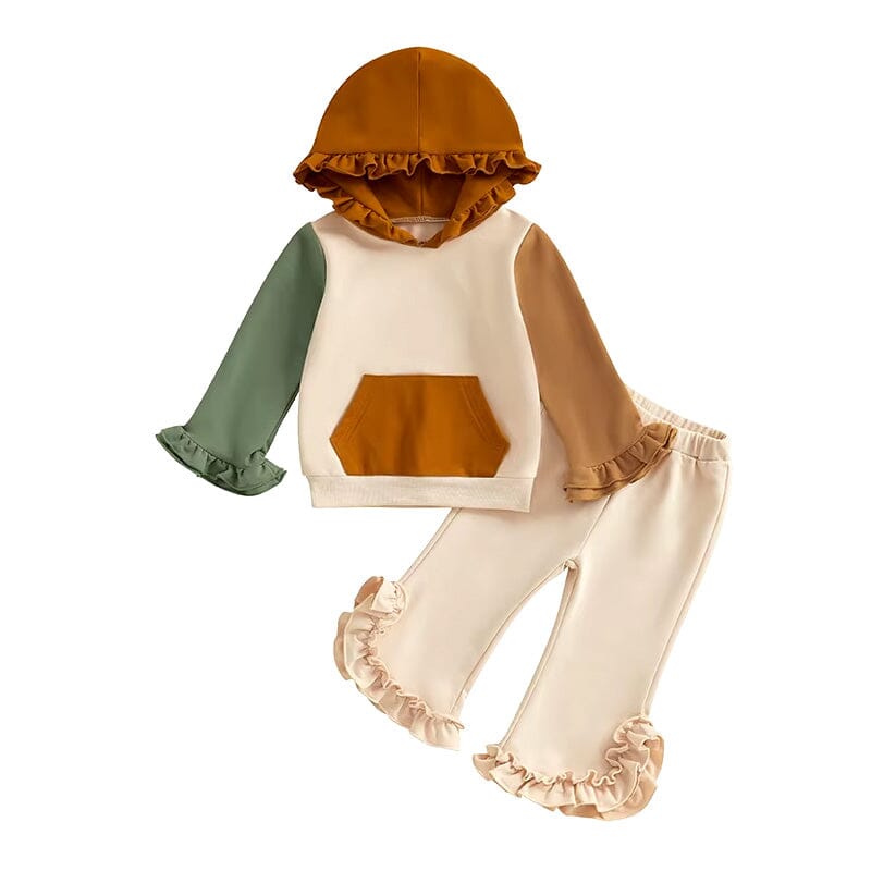This chic toddler girl fall set combines style and comfort with its unique color block design and soft, cozy materials. The ensemble includes a cream sleeveless hoodie with a bold mustard pocket, complemented by a ruffle-trimmed, detachable green long sleeve shirt, making it versatile for changing weather. The matching cream pants are accented with delicate ruffles at the ankles, adding a touch of whimsy and style.