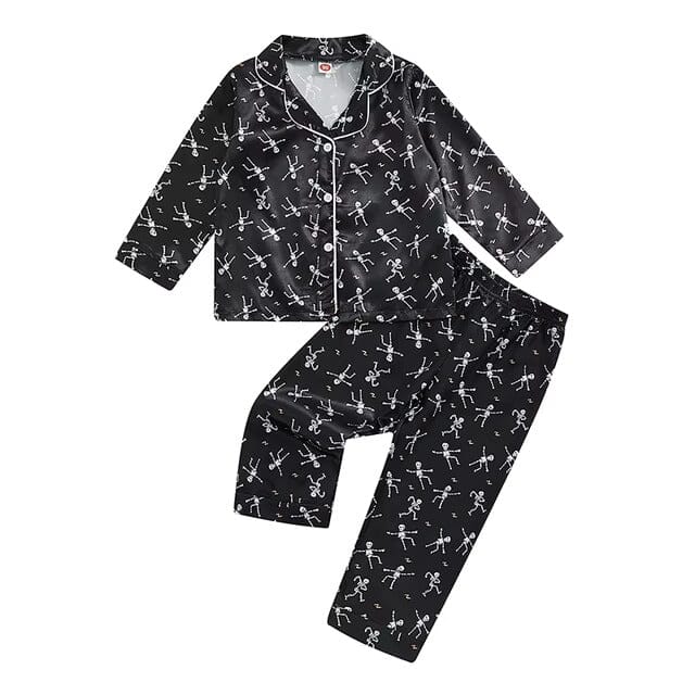 This playful unisex toddler pajama set features an eye-catching skeleton print, making it a fun and spooky choice for Halloween or themed pajama parties. The button-up top and matching pants are designed for comfort, crafted from soft, breathable fabric to ensure a cozy night’s sleep. Whether it's for trick-or-treating fun at bedtime or a Halloween family photo shoot, these pajamas will bring a festive vibe to your little one's nighttime wardrobe.