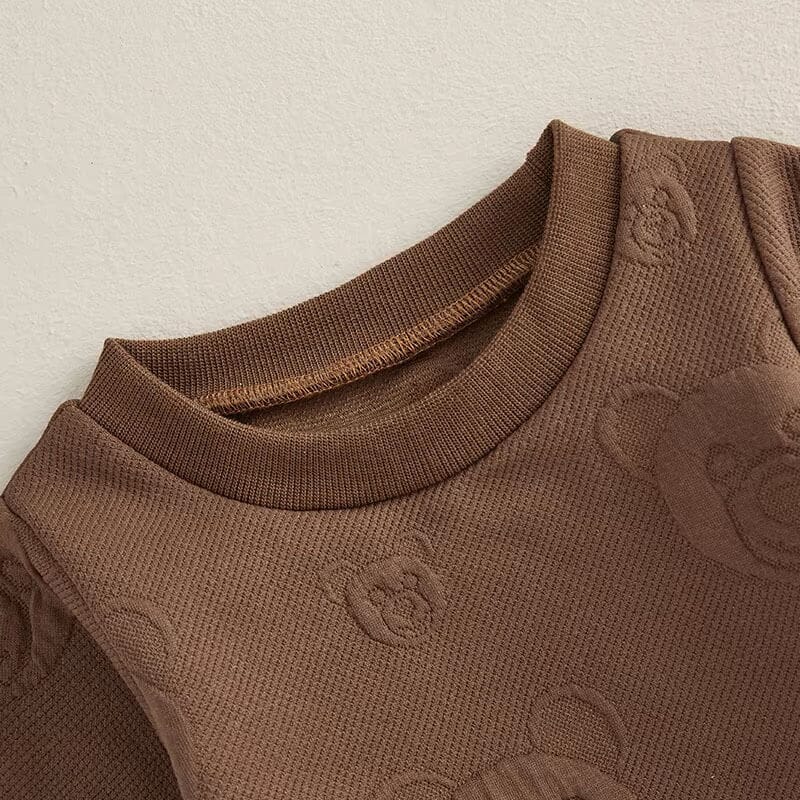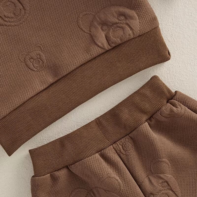 This delightful unisex baby set comes in three soothing colors: classic beige, rich brown, and soft pink, each featuring an adorable bear pattern that adds a touch of whimsy. Each set includes a cozy long-sleeve top and matching pants with cuffed ankles to keep your little one snug and stylish. deal for daily wear or special occasions, these sets are a wonderful addition to any baby's wardrobe, offering both comfort and style.
