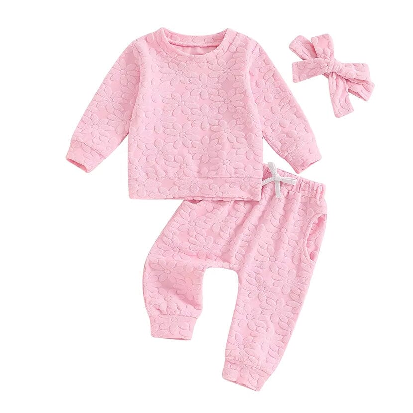 This charming little girl's set is available in four delightful colors—lavender, seafoam, buttercream, and blush—each offering a sweet and subtle style perfect for any day out. Crafted from a soft, textured fabric, these sets feature a comfortable long-sleeve top and matching pants that are ideal for playtime or lounging. The all-over floral embossed pattern adds a touch of whimsy and a gentle feminine flair to each piece. This versatile ensemble is a must-have addition to her wardrobe, ensuring she looks her best while feeling utterly comfortable.