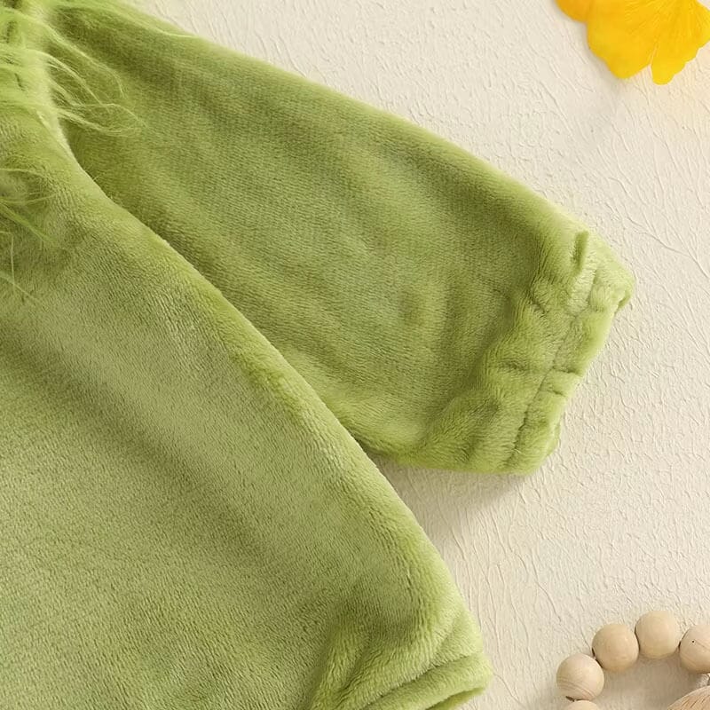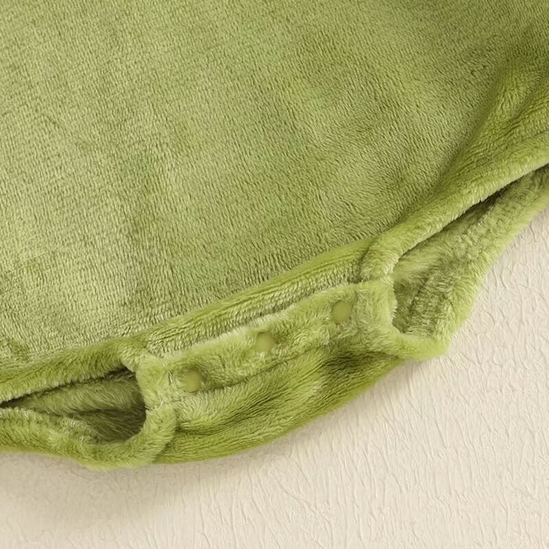 Capture the whimsy and charm of the holiday season with this adorable Grinch-inspired bodysuit. Designed with a rich, mossy green fabric, this outfit features a cozy hood complete with faux fur detailing that mimics the mischievous character’s hair. Perfect for Christmas photos or festive family events, this bodysuit will make your baby the cutest little "Grinch" in town, spreading cheer and laughter wherever they go!