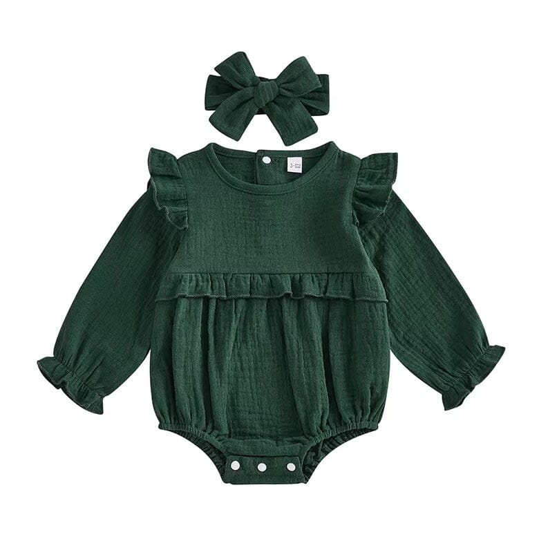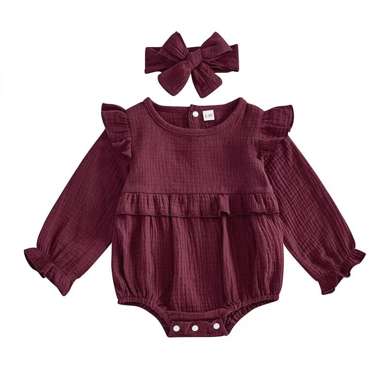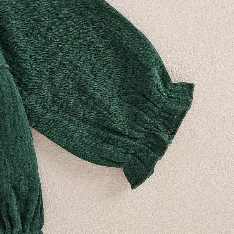 This delightful collection of baby girl rompers is available in four elegant colors: classic cream, rustic tan, deep forest green, and rich burgundy. Each romper features charming ruffled sleeves and a comfortable, elastic waistband that ensures a perfect fit for your little one. Perfect for photo shoots or family gatherings, these rompers blend adorable aesthetics with practical comfort.