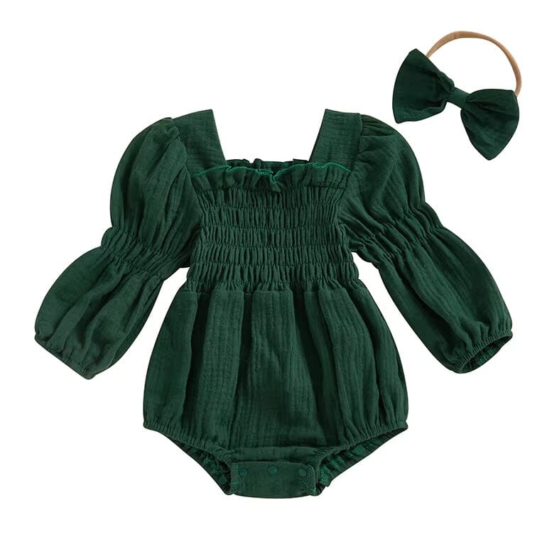 These charming baby girl rompers are available in four lovely shades. Each romper is designed with beautiful ruching and elasticized details that not only ensure a perfect fit but also add a touch of vintage charm. Matching headbands in coordinating colors complete the outfit, making these rompers a perfect choice for photo sessions or family gatherings.