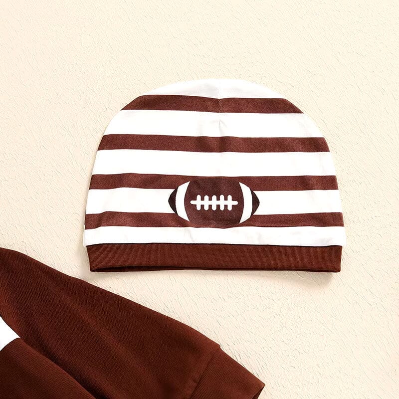 Get ready for game day with our sporty baby boy set that brings both style and comfort to your little one's wardrobe. This adorable three-piece outfit includes a football-inspired bodysuit, coordinating striped pants, and a snug cap to keep your baby warm and cozy. This set is a must-have for any family football gatherings, ensuring your little one looks cute and stays comfortable throughout the day.