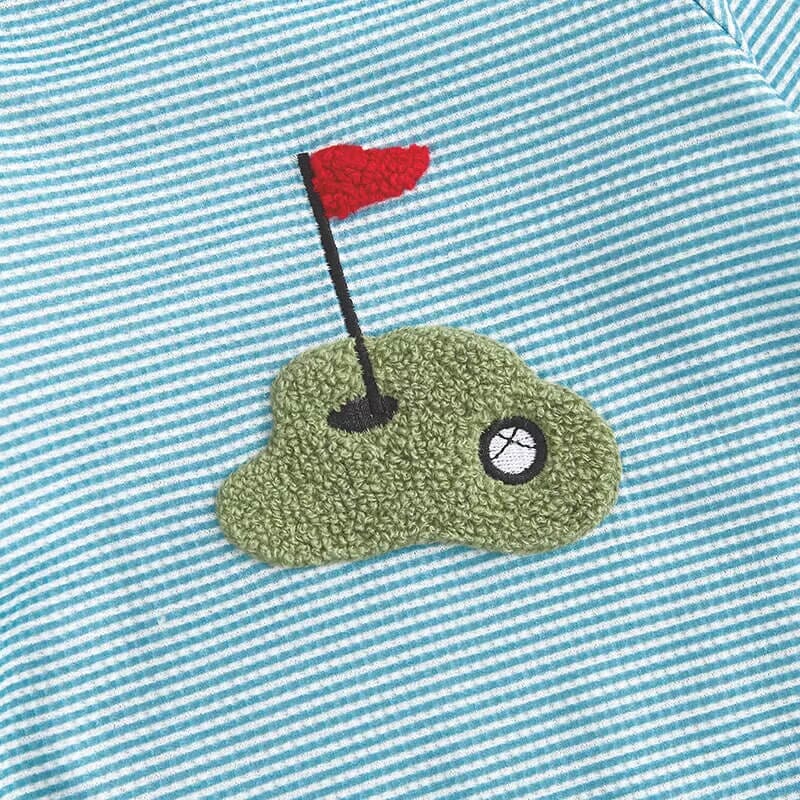 Dress your little one in this charming unisex baby jumpsuit, featuring a sweet golf-themed appliqué that adds a playful touch. Its soft blue and white stripes offer a classic look, while the cozy cotton blend material ensures comfort throughout the day. The practical snap closures make dressing and diaper changes a breeze, ideal for busy parents. This jumpsuit is not only perfect for daily wear but also makes a great outfit for family outings and photo sessions.