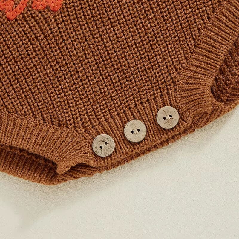 This charming unisex baby romper is the ideal outfit for celebrating Thanksgiving in style. Knitted from soft, breathable yarn, it ensures your little one stays comfortable during holiday festivities. The delightful turkey embroidery on the front adds a playful touch, perfect for the season. Its warm, earthy tones and snug fit make it a must-have for any baby's autumn wardrobe, ensuring they look adorable on Turkey Day.