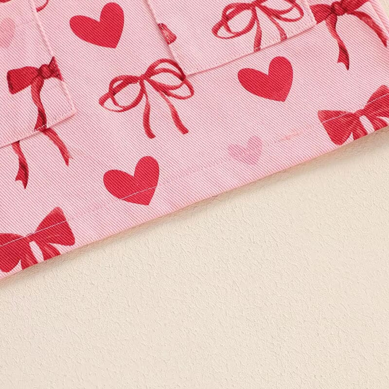 This delightful baby girl set for Valentine's Day includes a vibrant red ribbed bodysuit paired with a charming pink heart-printed overall. The bodysuit features playful ruffle detailing on the shoulders, offering a touch of elegance and comfort with its soft, stretchy fabric. The overalls are adorned with an all-over heart and bow pattern, set against a light pink background, perfect for the season of love.