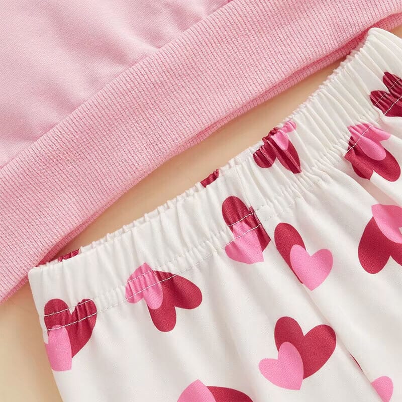 Celebrate love and style this Valentine’s Day with this adorable little girl’s set! The pink sweatshirt features an eye-catching "XOXO" design with glittery and textured heart details, adding a festive and playful vibe. Paired with charming flared pants covered in pink and red heart prints, this outfit is perfect for spreading love and joy. This delightful set is a must-have for Valentine’s festivities and makes a great gift for your tiny fashionista!
