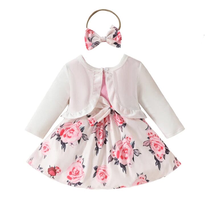This adorable little girl dress set is perfect for any special occasion. The set includes a beautiful floral dress with a matching headband and a cozy long-sleeve cardigan. The dress features a soft pink bodice with a bow detail at the waist, complemented by a full skirt adorned with a charming rose print. Ideal for family gatherings, photoshoots, or holiday events, this dress set will make your little one the star of the show.