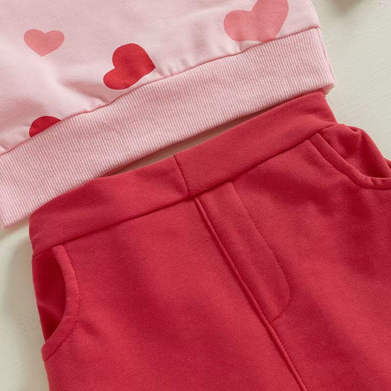 This adorable toddler girl set is perfect for celebrating St. Valentine’s Day in style. The top features a playful "Love" design surrounded by charming red hearts, adding a festive and sweet touch. Paired with a bright red skirt adorned with pom-pom trim, this outfit is both stylish and comfortable for your little one. Ideal for family gatherings, Valentine's parties, or cute photo sessions, this set is a must-have for spreading love and joy!
