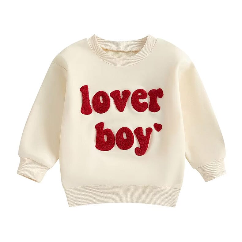 Celebrate love with our "Lover Boy" sweatshirts, available in three stylish colors: classic black, creamy ivory, and heather grey. These charming tops feature bold, textured lettering that adds a pop of fun and festivity to your little one's outfit. Perfect for St. Valentine's celebrations, these sweatshirts pair wonderfully with any casual bottoms for a cute, thematic look.