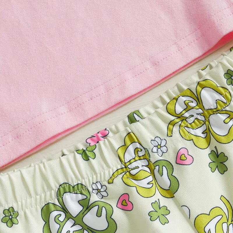 This charming toddler girl's set is perfect for celebrating St. Patrick's Day in style. The soft pink tee features a playful "Lucky" clover design in vibrant green, making it a festive choice for any holiday event. Paired with bell-bottom pants adorned with a lively clover print, this outfit combines comfort and cheer in one. Ideal for a St. Patrick's Day parade or a family gathering, this set is sure to spread joy and luck wherever it goes!
