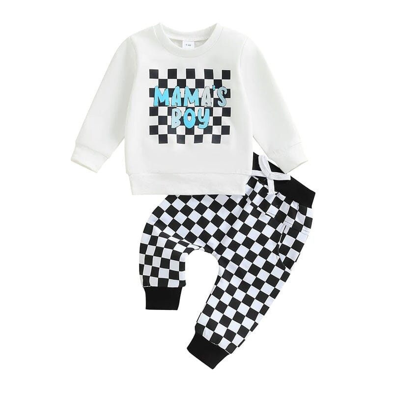 Your little guy will stand out in style with this bold and playful "Mama's Boy" set. The cozy white sweatshirt features a fun checkered pattern and eye-catching blue text that declares your little one's love for mama. Paired with matching checkered pants, this outfit brings together comfort and flair in perfect harmony. Whether at the playground or lounging at home, this set is perfect for adding a cool, confident look to your little one's wardrobe.