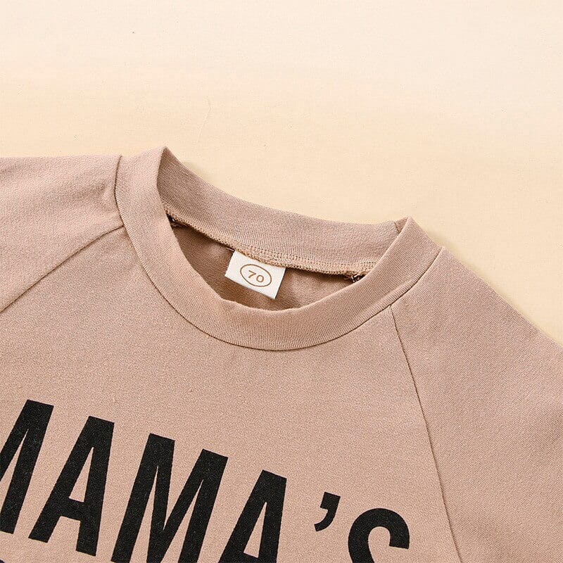 This little boy outfit features a cute sweatshirt with lettering "Mama's coffee date" and solid pants. The sweatshirt is cozy and comfortable, while the pants offer ample support and protection for the child's legs. The outfit is suitable for indoor and outdoor activities, making it a versatile addition to any little boy's wardrobe. The trendy design and functional features make it perfect for your mini.