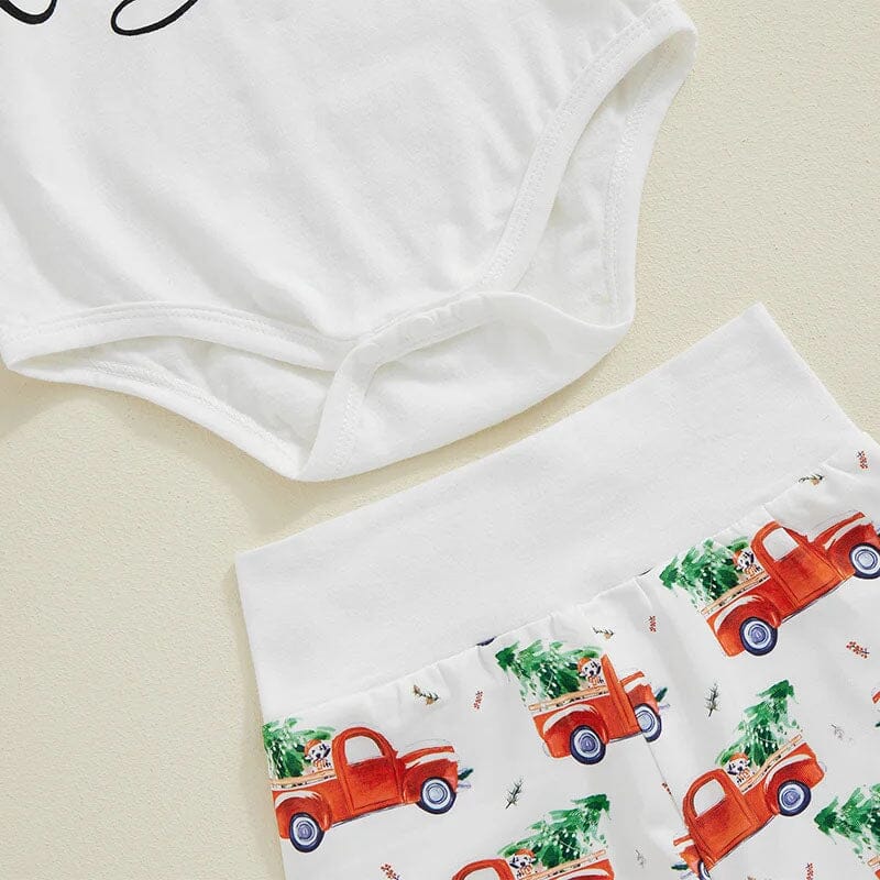Celebrate your baby’s first Christmas with this adorable unisex set, designed to make the season extra special. The set includes a cozy long-sleeve bodysuit featuring the sweet message "My First Christmas" in elegant script. Paired with festive pants adorned with cheerful red trucks carrying Christmas trees, this outfit is perfect for holiday photos and family gatherings. Crafted from soft, breathable fabric, this set provides ultimate comfort for your baby’s first holiday celebrations.