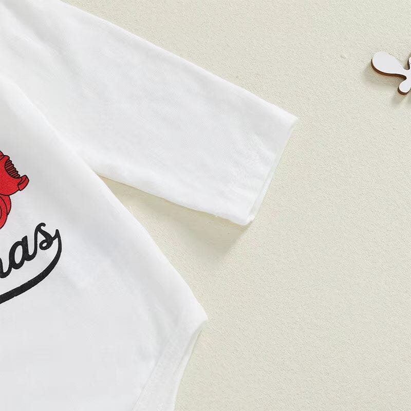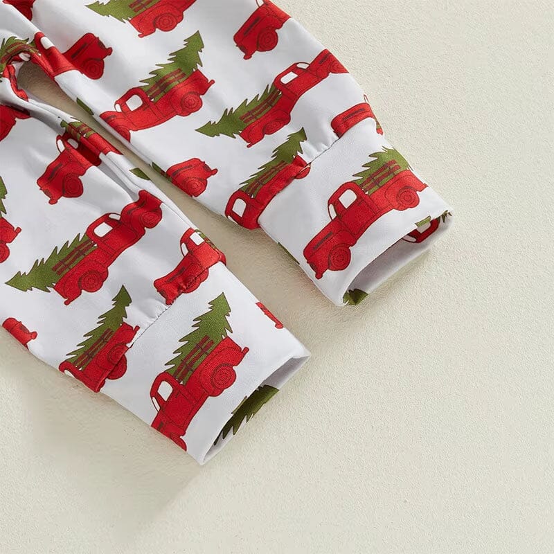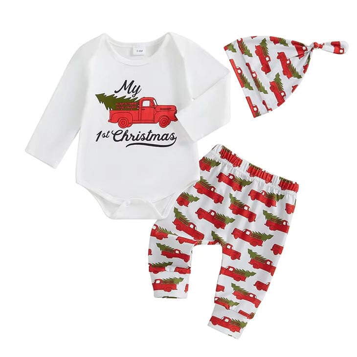This delightful unisex baby set is specially designed to celebrate your little one's very first Christmas. Featuring a charming bodysuit adorned with the phrase "My 1st Christmas" alongside a festive red truck carrying a Christmas tree, it captures the spirit of the season. The accompanying pants are decked out in a cheerful red truck and tree print, perfect for holiday photo ops.