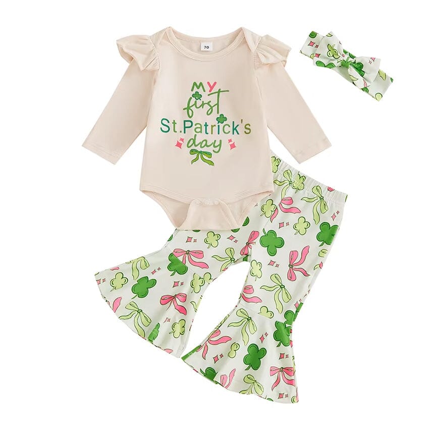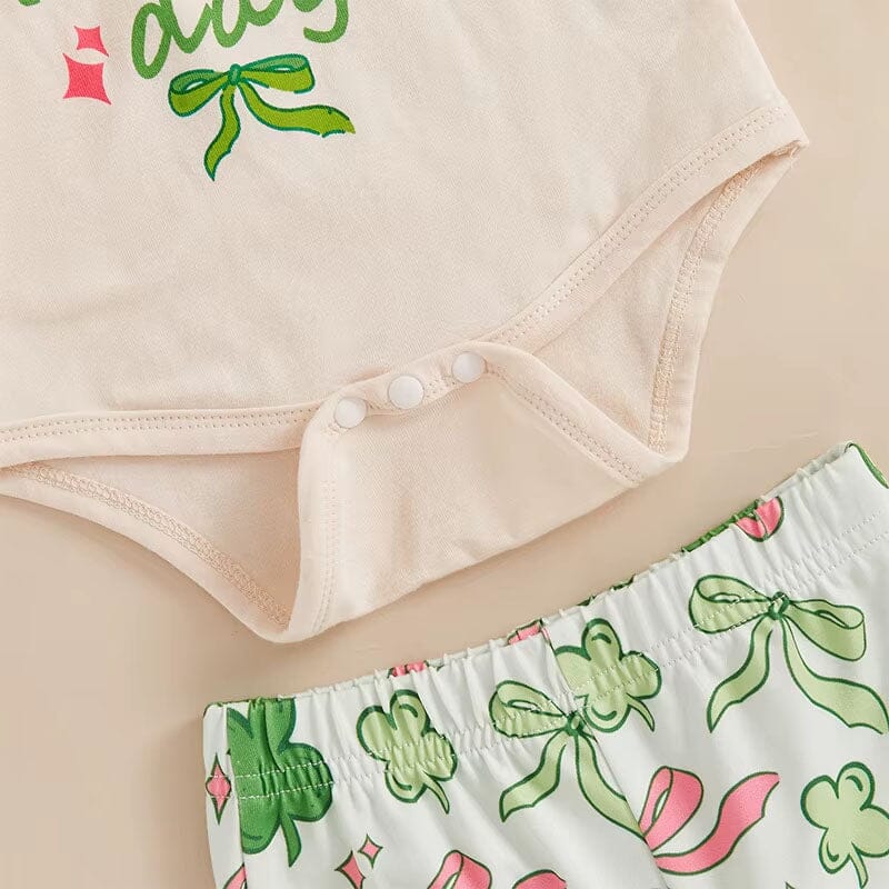 Celebrate your little one's first St. Patrick's Day in adorable style with this delightful baby girl set. The soft, pastel bodysuit is adorned with "My First St. Patrick's Day" in vibrant green and pink lettering, perfect for capturing those memorable moments. Paired with playful pants featuring a festive print of shamrocks and pink ribbons, this outfit is as charming as it is comfortable.