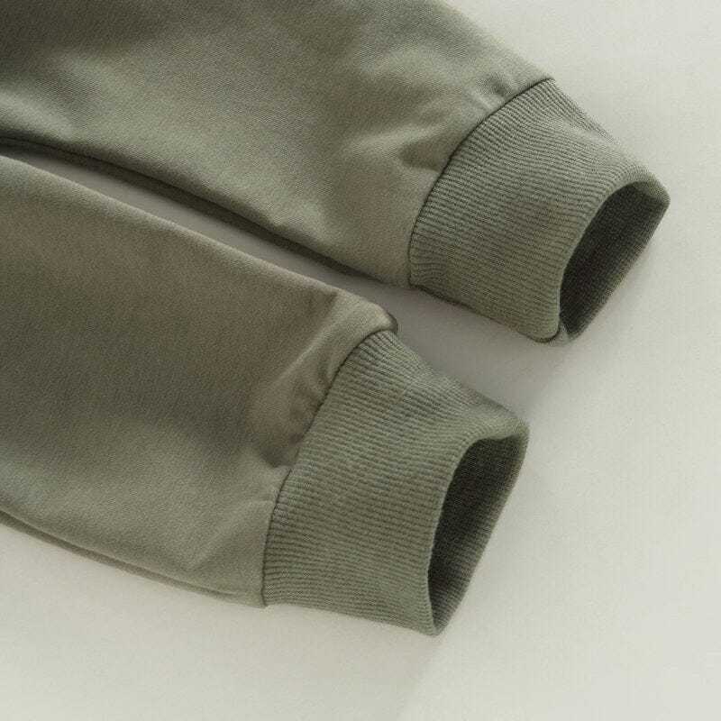 This festive children's set artfully combines the vibrant hues of the holiday season with contemporary style. The red, grid-patterned hoodie stands out with its eye-catching design, perfectly complemented by a contrasting olive-green hood and a rustic leather patch on the chest. The matching olive-green pants, with their adjustable drawstring, promise a snug fit for playful winter days.