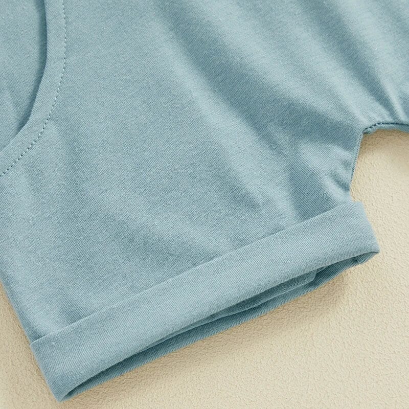 This delightful little boy's set is the epitome of summertime fun, featuring a playful print of swaying palm trees and wavy lines reminiscent of gentle sea currents. The soft, muted blue shorts are complemented by a matching pocket detail on the T-shirt, tying the seaside theme together perfectly. With its comfortable fit and breathable fabric, it's ideal for a day of adventure, from building sandcastles on the beach to exploring the playground.