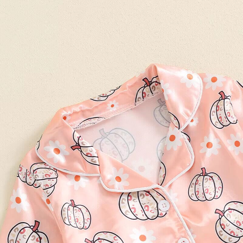 This adorable toddler pajama set showcases a delightful pumpkin print on a pinky peach background, making it a charming choice for fall and Halloween. The button-up top and matching elastic waistband pants are made from a cozy, breathable fabric to ensure your little one stays comfortable throughout the night. Perfect for Halloween festivities, cozy fall evenings, or family photos, these pajamas bring a festive touch to your toddler's bedtime routine.