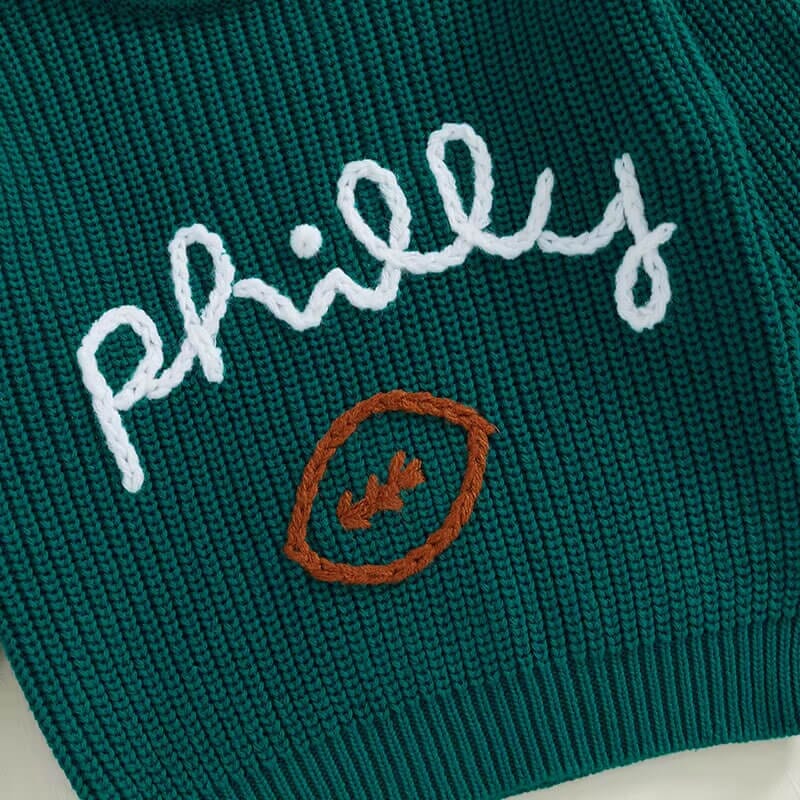 Dress your little one in team spirit with this cozy unisex baby sweater, designed with Philadelphia Eagles fans in mind! The sweater's rich green color and the playful "Philly" embroidery in white capture the essence of fan pride. An adorable football patch adds a sporty touch, making it a standout piece in any tiny fan's wardrobe. This charming sweater is sure to be a hit at any Eagles gathering, ensuring your baby scores big in style and team spirit.