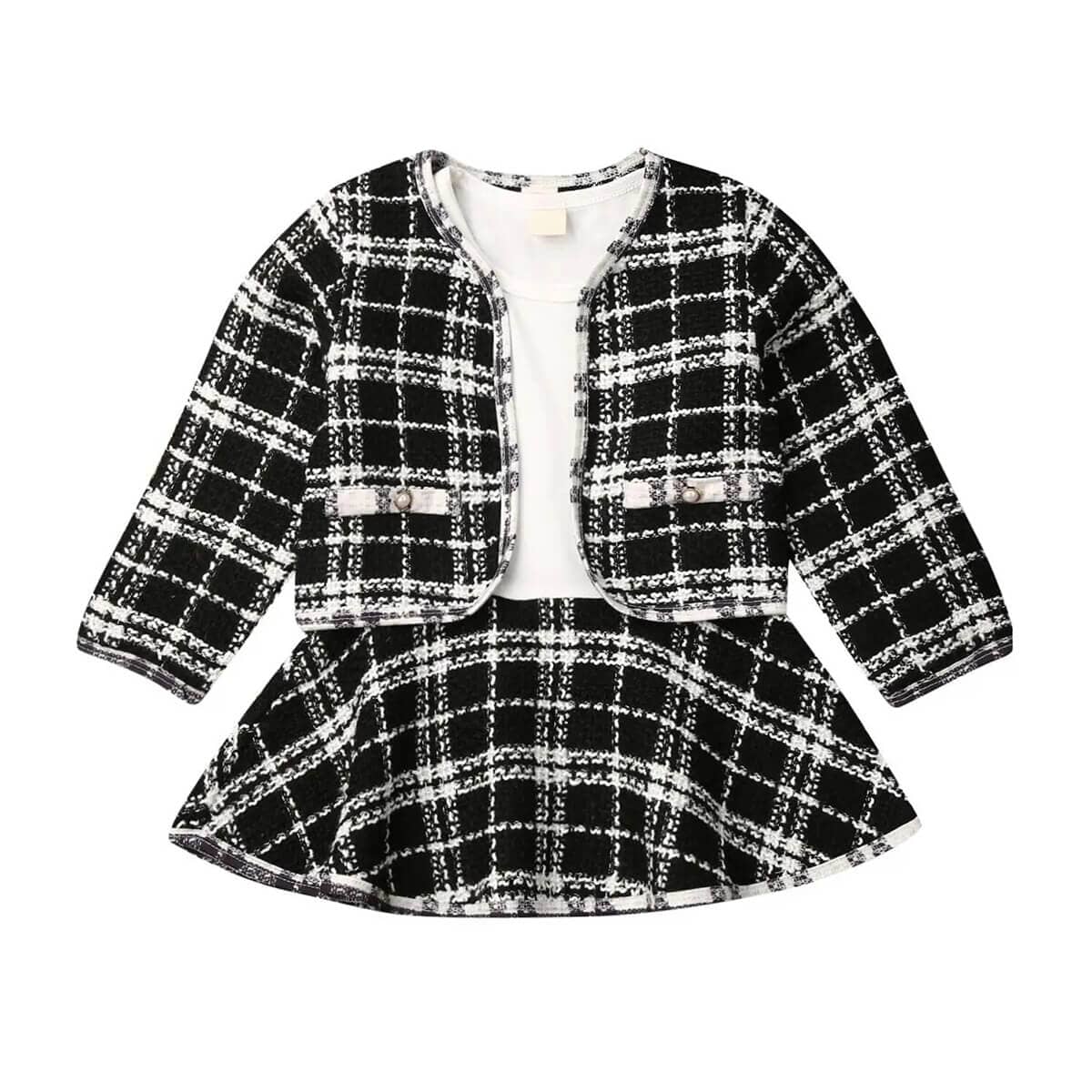 Elevate your little fashionista's wardrobe with this chic toddler girl outfit. Exuding timeless elegance, the set is adorned with a black and white checkered pattern that's reminiscent of classic tweed designs. The jacket, with its neat round collar and shimmering button details, pairs seamlessly with the flared skirt, creating a cohesive look. Both pieces are intricately crafted, ensuring not just style but also comfort for your young one.